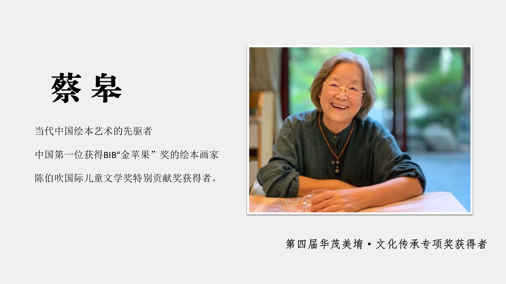 蔡皋:第四届华茂美堉·文化传承专项奖获得者,当代中国绘本艺术的先驱者,中国第一位获得BIB“金苹果”奖的绘本画家,陈伯吹国际儿童文学奖特别贡献奖获得者。