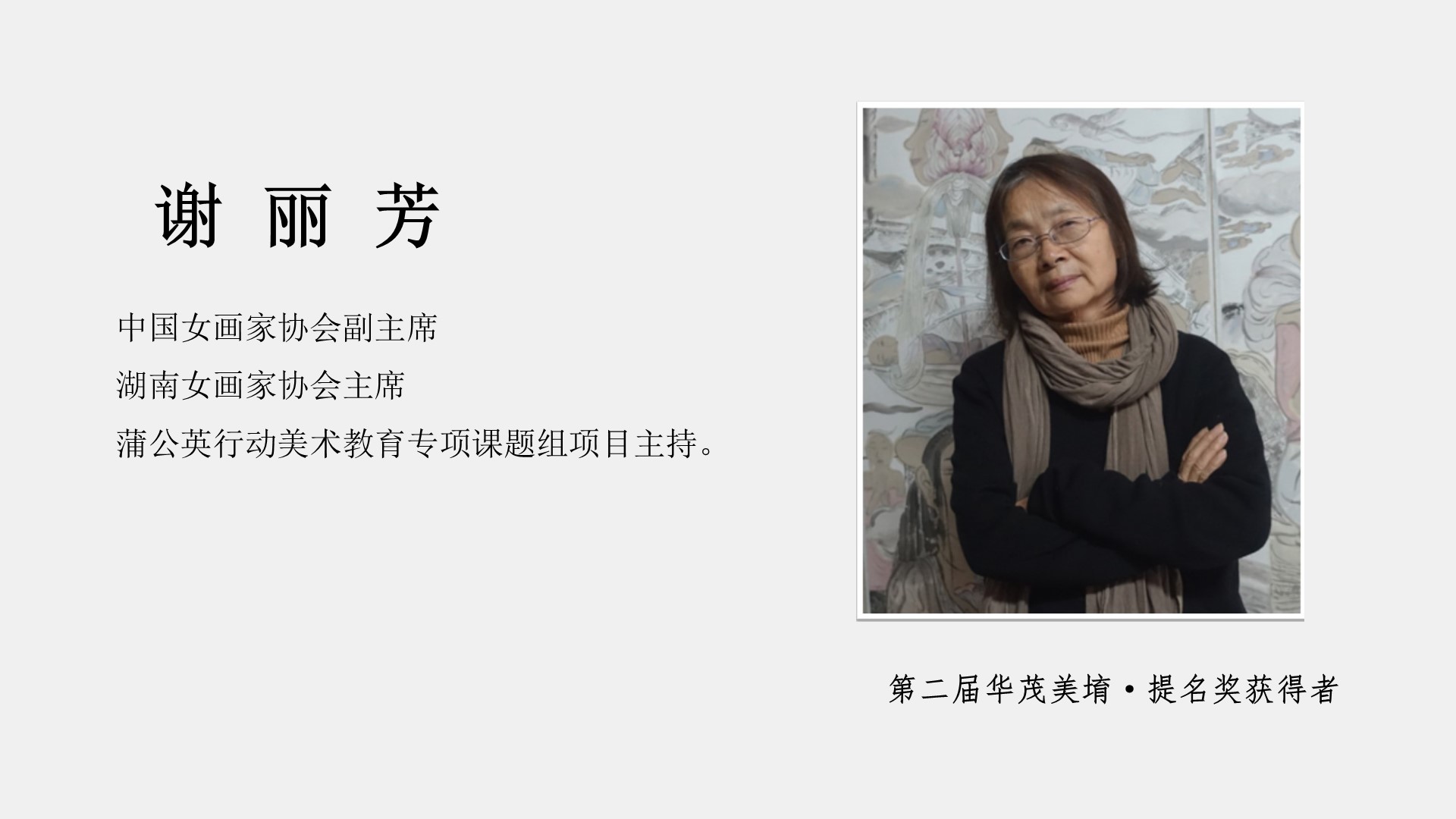 她就是第二届华茂美堉奖提名奖获奖者,中国女画家协会副主席、湖南女画家协会主席、蒲公英行动美术教育专项课题组项目主持——谢丽芳女士。