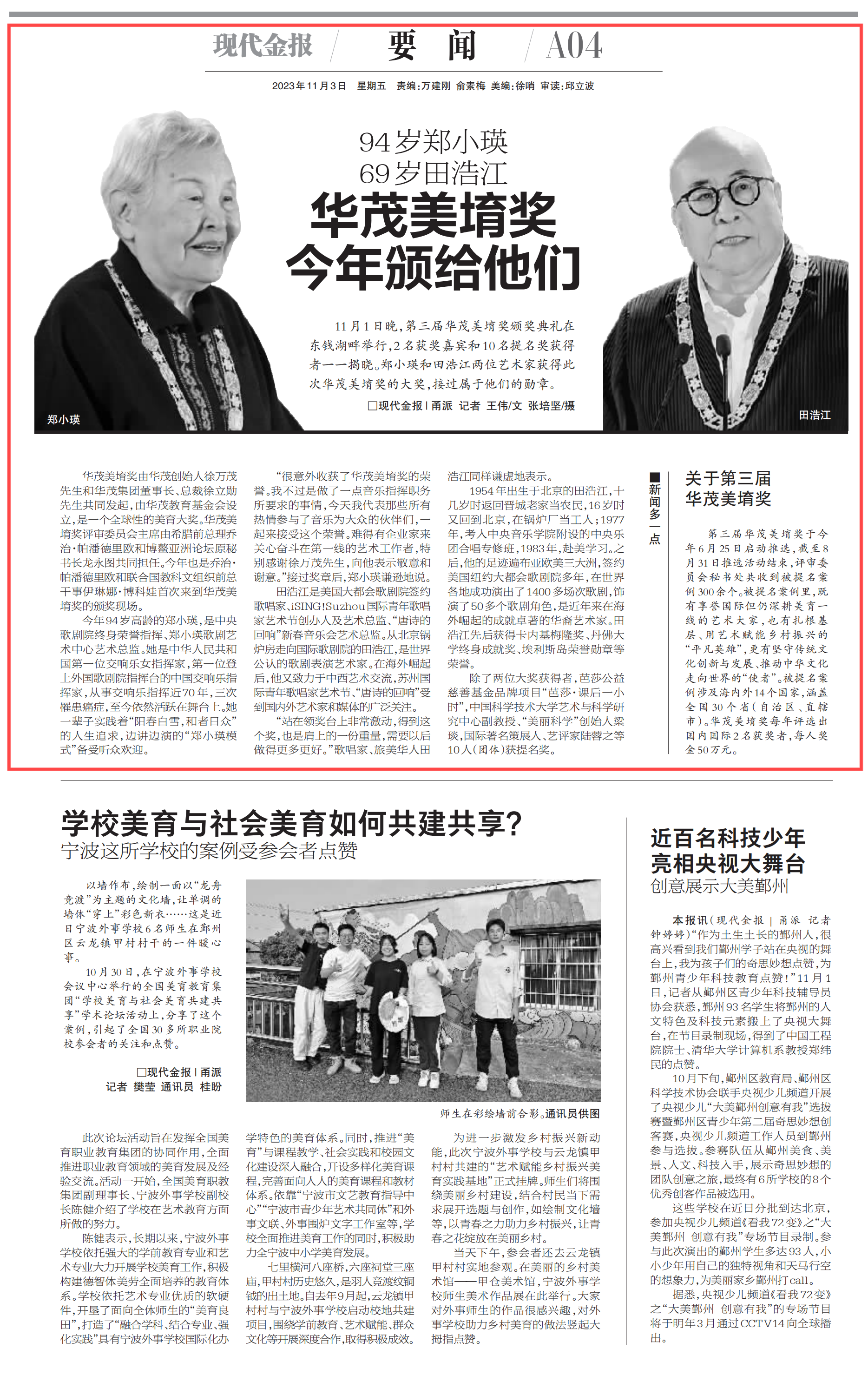 11月1日晚,第三届华茂美堉奖颁奖典礼在东钱湖畔举行,2名获奖嘉宾和10名提名奖获得者一一揭晓。郑小瑛和田浩江两位艺术家获得此次华茂美堉奖的大奖,接过属于他们的勋章。