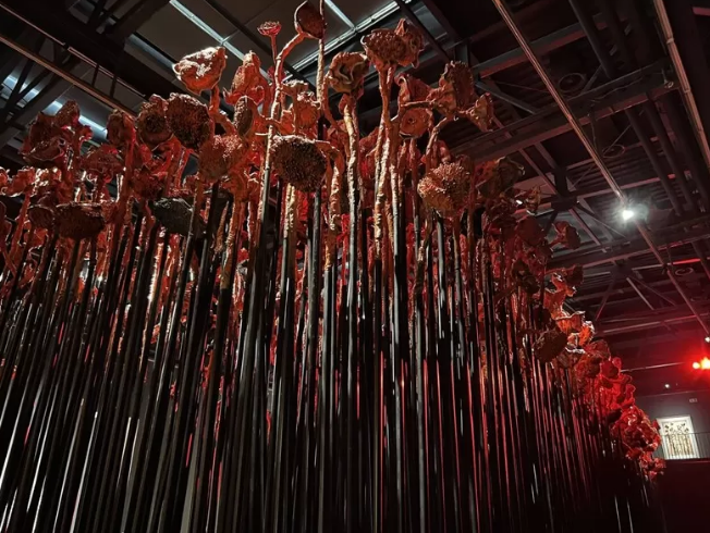在2号展厅“共生”篇章入口处1600根6米高的葵与莲蓬组成的装置。葵生于旱地,莲生于水泽,二者并置,引发关于不同生命形态能否“共生”,火与书(精神)能否因燃烧而“共生”的哲学思考。在不同展出地(如德国、国博),这片“葵园”被赋予不同的感受——密林、废墟、牛羊群,而在宁波则如“炉火正红”,充满生长的力量。