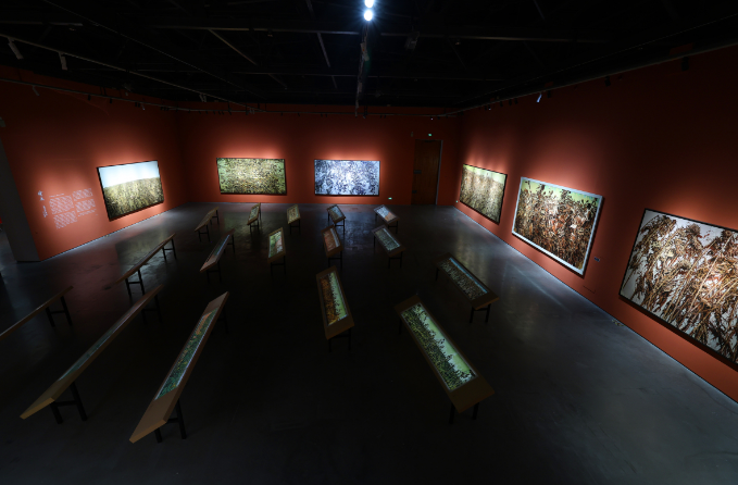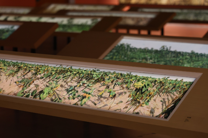 此外,该展区创新性地采用“阅览桌式”展陈,一幅幅葵园作品如长卷般铺展,让观者仿佛行走在葵园的地平线上;墙上12米长、3米高的巨幅画作,以数百个葵盘堆叠成“葵墙”。