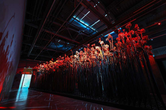 展厅内,炽红的金属质感与“淬火”般的视觉效果,让这片“火的荒原”既展现出葵原大地的巍峨,又传递出毁灭与新生的对话。