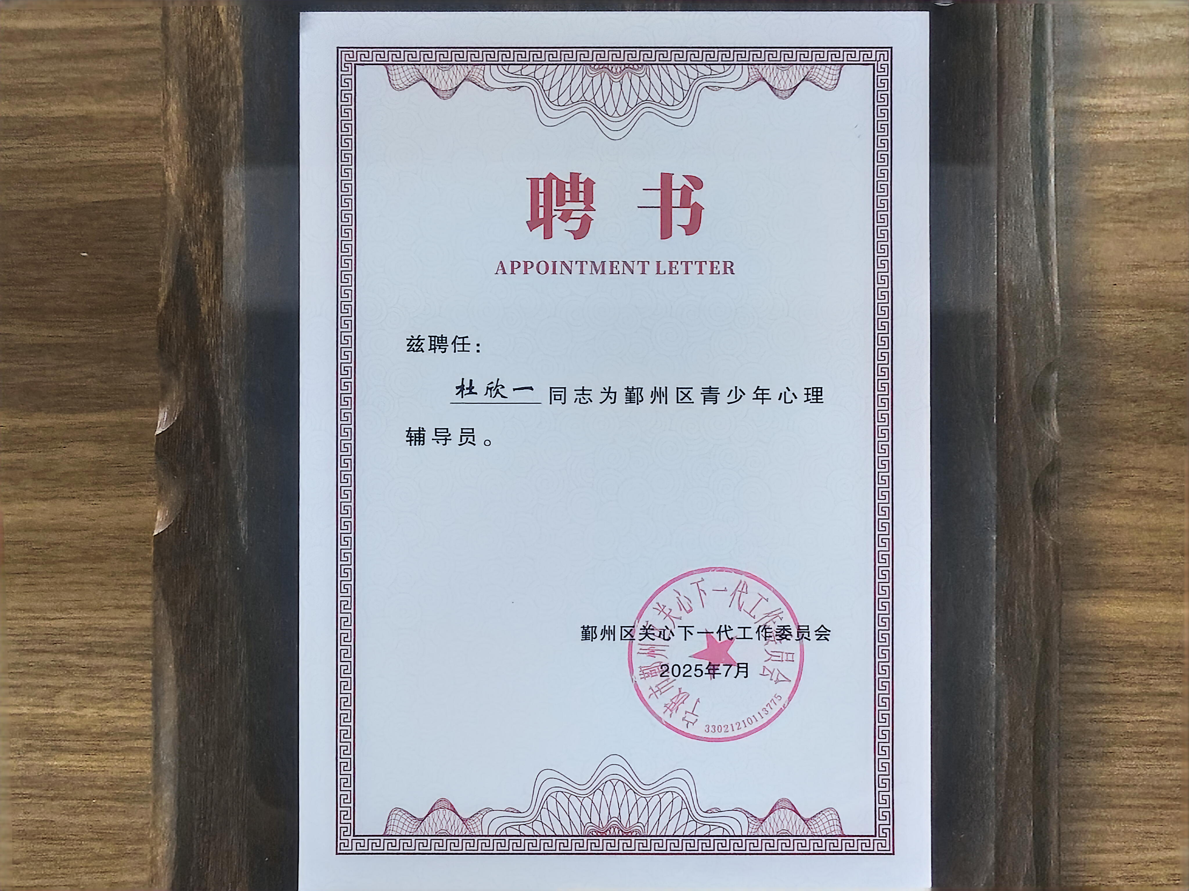 徐万茂美堉公益基金会理事、秘书长杜欣一获聘「鄞州区青少年心理辅导员」