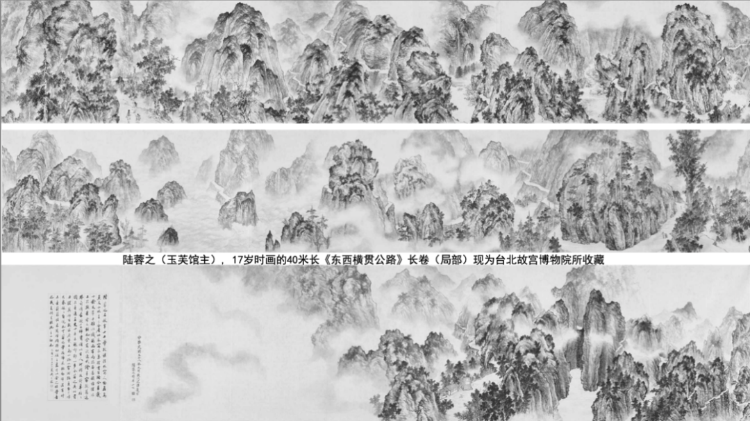 陆蓉之出身名门世家,从小便显露出异于常人的艺术天赋。她师从刘雅农、张大千、吴子深等大师,9岁获得国际⼉童美术比赛奖项,13岁开个人画展,17岁时徒步台湾的横贯公路,用两个月时间趴在地上,不打草稿,一气呵成,绘就了40米的长卷《东西横贯公路》,这幅作品被台北故宫博物院收藏。