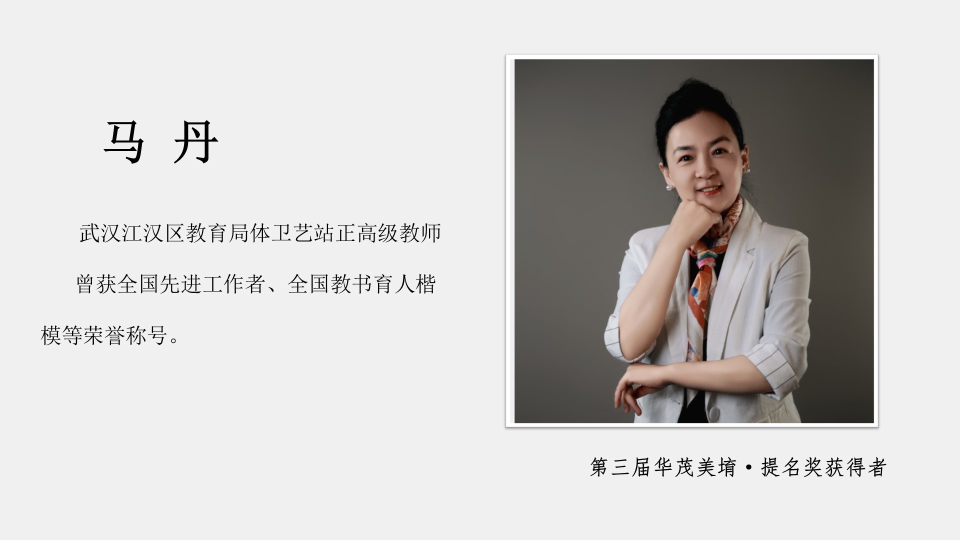 马 丹/ Ma Dan 湖北省武汉市江汉区教育局体卫艺站正高级教师、全国先进工作者、全国教书育人楷模。