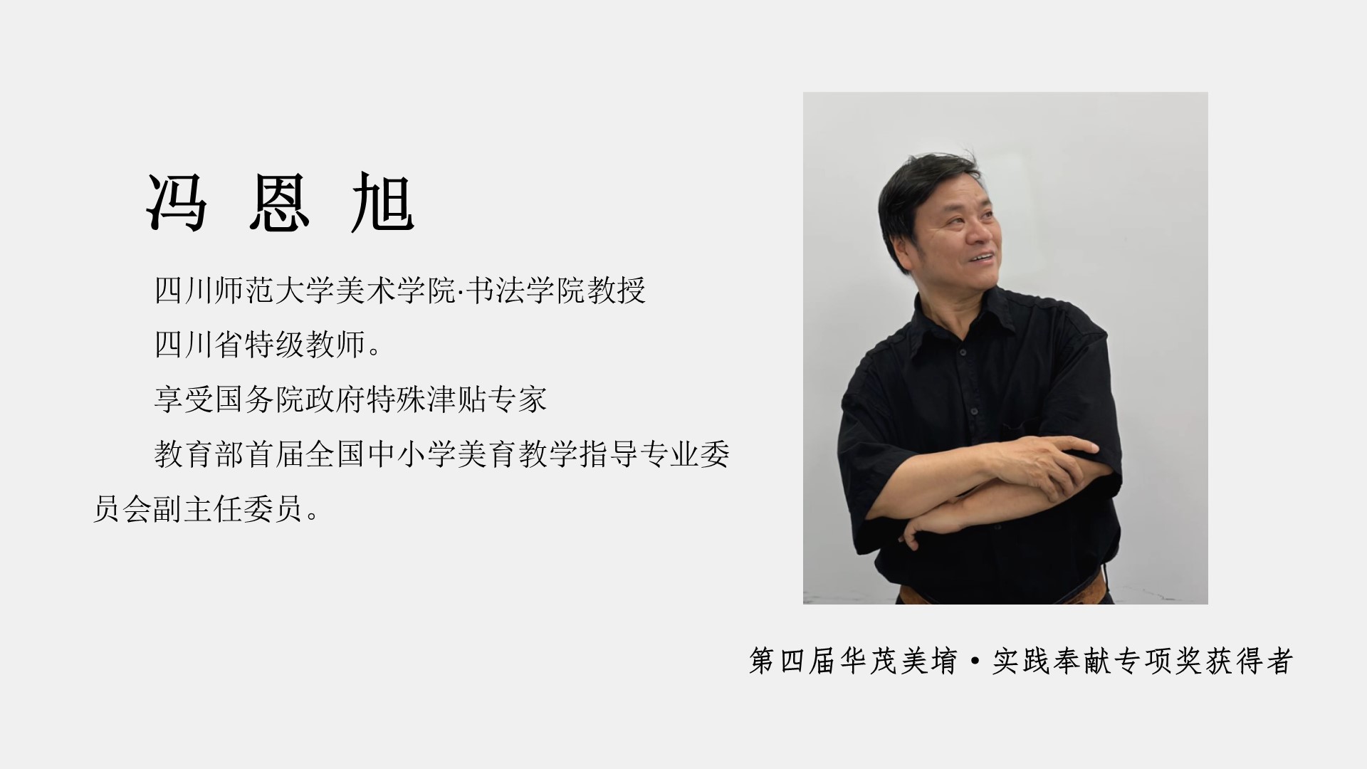 冯恩旭:第四届华茂美堉·实践奉献专项奖获得者,四川师范大学美术学院·书法学院教授,教育部首届全国中小学美育教学指导专业委员会副主任委员,享受国务院政府特殊津贴专家,四川省特级教师。