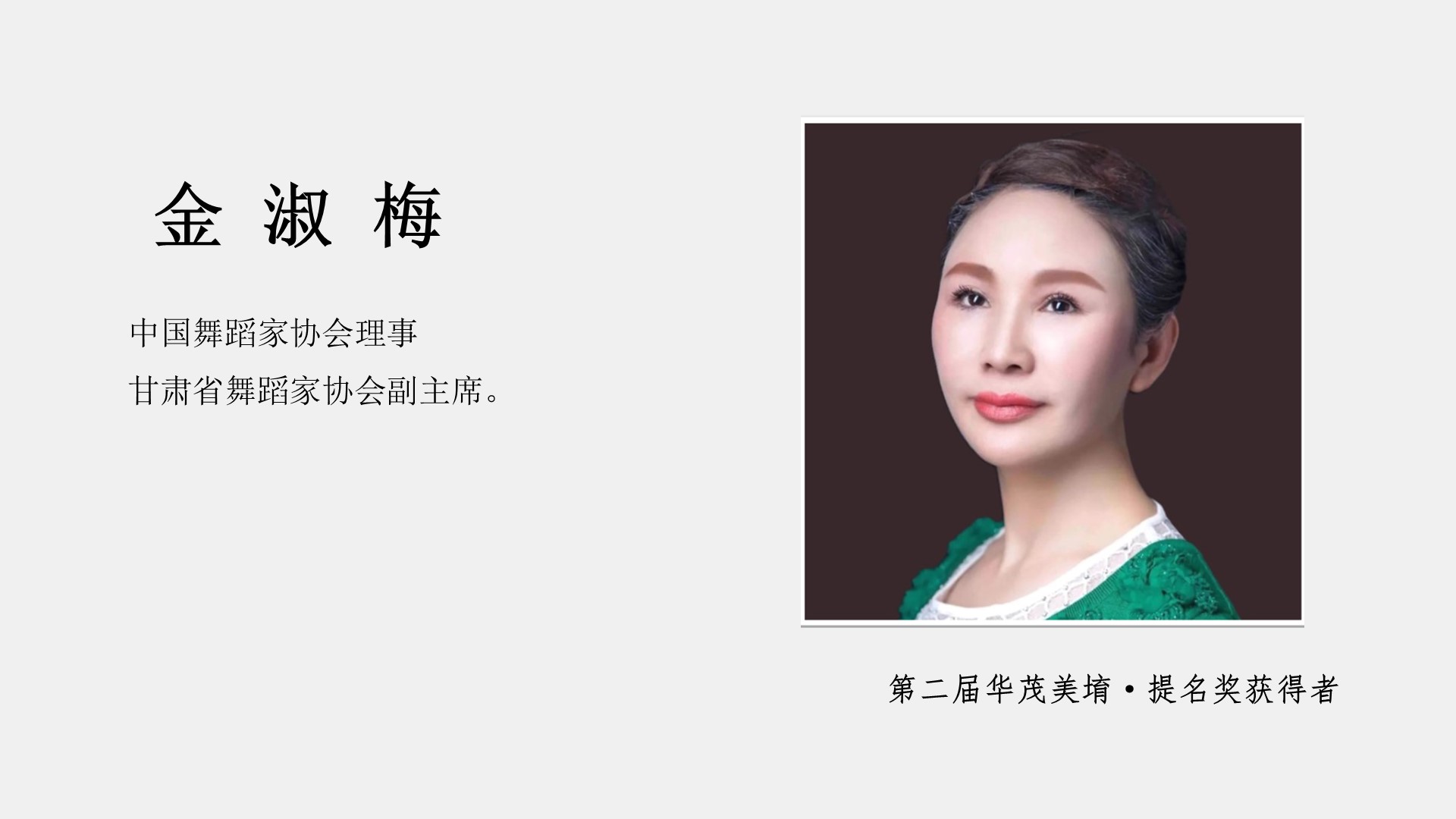 她就是第二届华茂美堉奖提名奖获奖者,中国舞蹈家协会理事,甘肃省舞蹈家协会副主席——金淑梅女士。