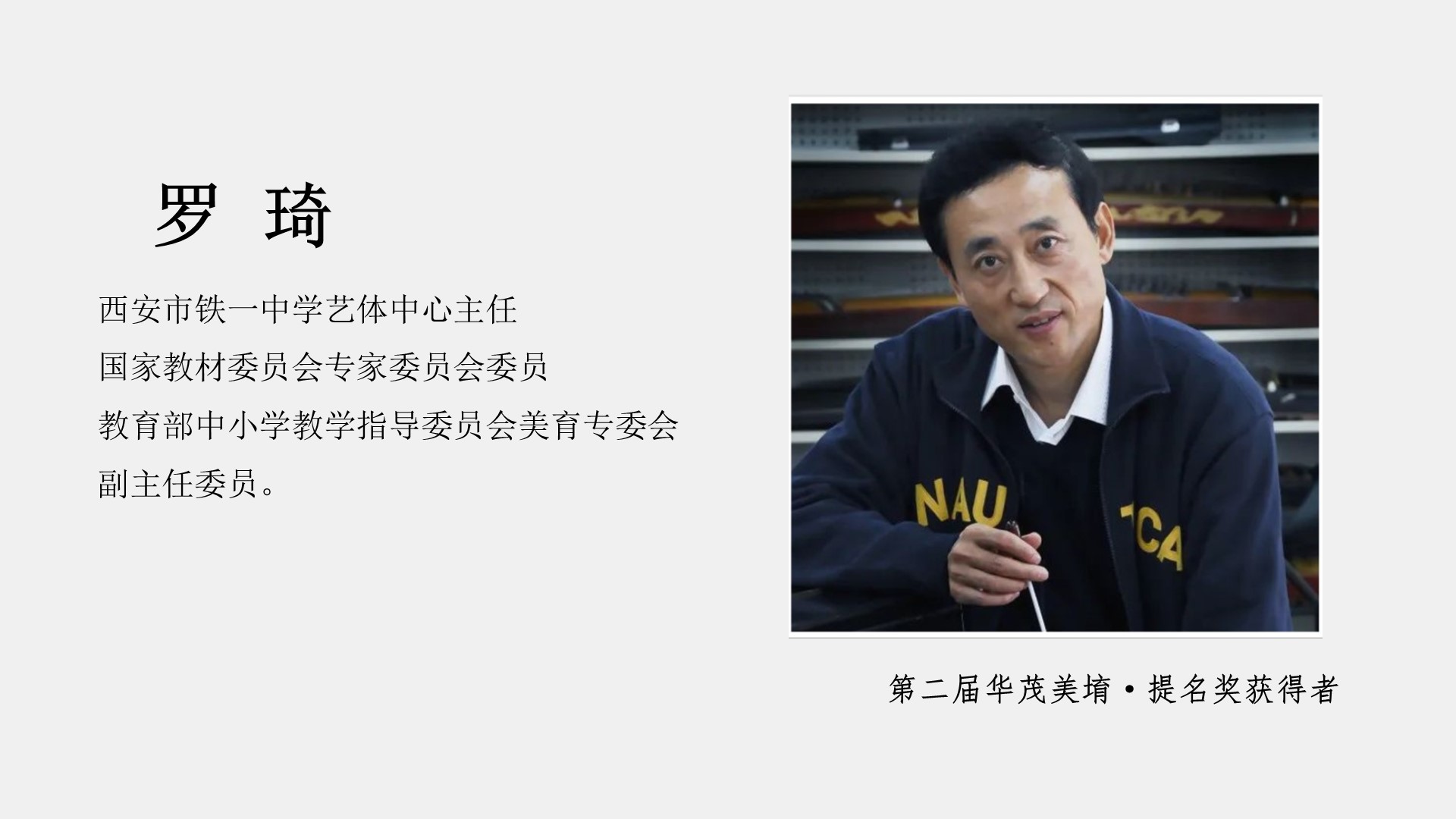 他就是第二届华茂美堉奖提名奖获奖者,西安市铁一中学艺体中心主任、乐团指挥、音乐教师,国家教材委员会专家委员会委员,教育部中小学教学指导委员会美育专委会副主任委员——罗琦老师。