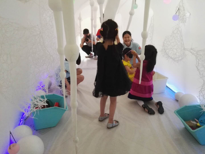 胡俊称这个装置为“大虫洞探秘”,游戏规则是参与者佩戴眼罩入内体验盲人用触觉感知世界的方式。所有儿童参与者,均可带来一件礼物交换,前提是,拿走礼物之前,必须要把它画出来。全过程,明眼人均蒙眼进行,而盲校学生则担任“教师”的角色,指导活动并教授版画。