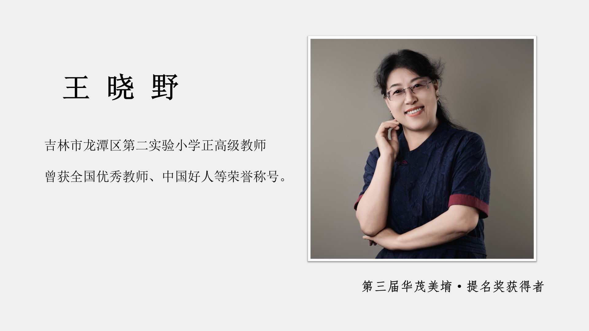 王晓野/ Wang Xiao Ye 现任吉林市龙潭区第二实验小学正高级教师,曾获全国优秀教师、中国好人、吉林好人·最美教师暨黄大年式好老师等荣誉称号。